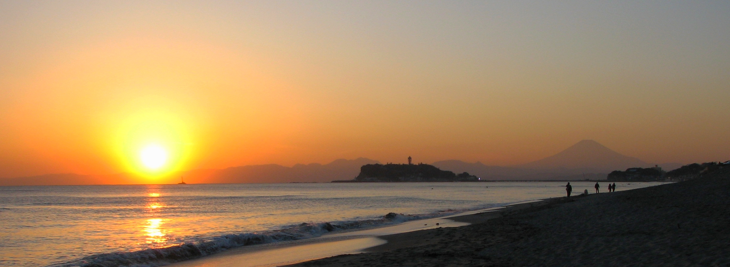 (鎌倉海岸から夕陽の江の島と富士山を望む、吉川撮影)