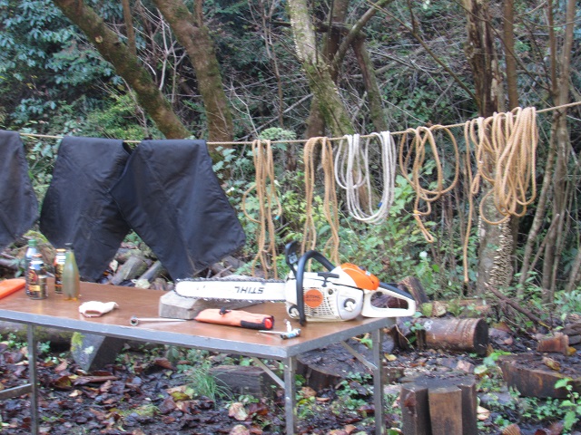 まづはベースでテントを設営して雨をしのぎながら準備体操と作業前の注意事項の朝礼です。