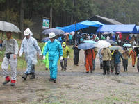 雨中でも現場に行きたい人はー、と問われ、傘のない人も歩き出した。足元はぬかるみだ。勇気があるなあ。