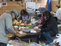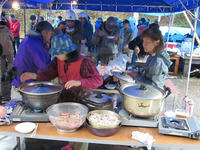 調理班は、最初は小屋の中で炊き出しの準備を始めたが、途中からは都合ですべてを小屋の外でやることになった。ずぶぬれだ。
