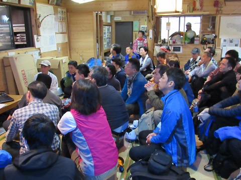 小屋の中では山崎さんがビデオで高尾の動物の生態を説明し聴衆は身を乗り出して聞いている。外の雨を忘れて小屋の中は熱気でむんむん。