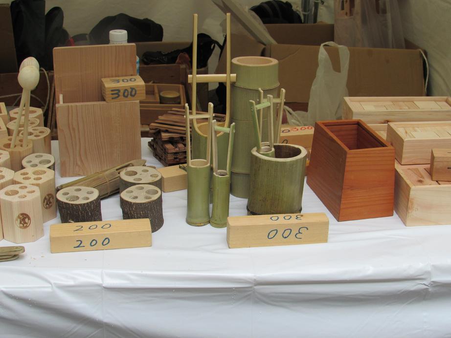 木工班苦心の商品は雨にぬれないようにいったんテントの奥に引き込めることになった
