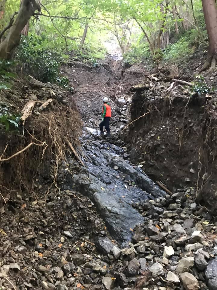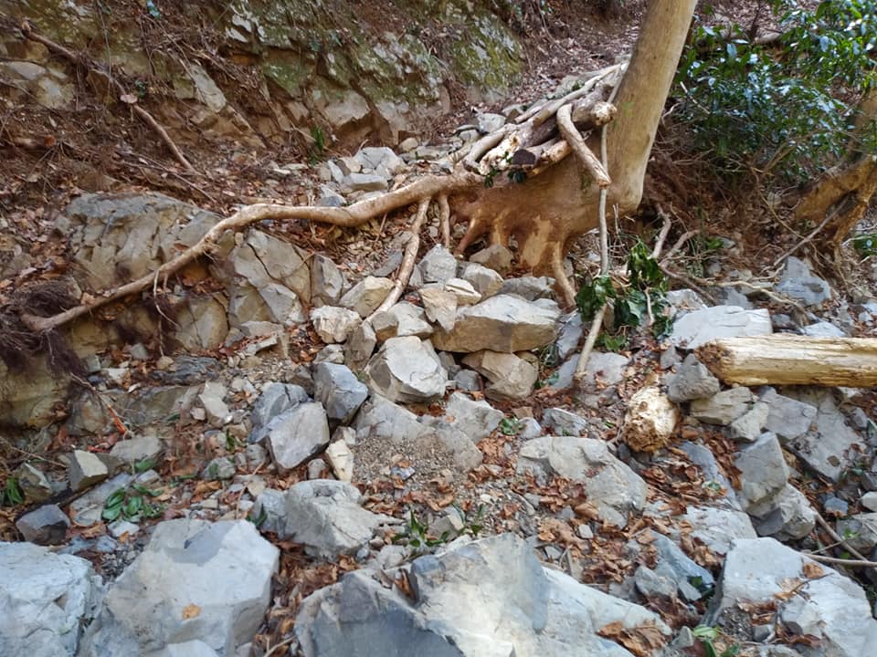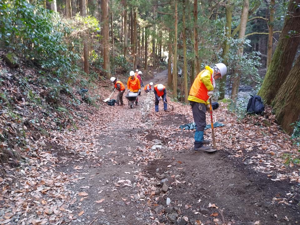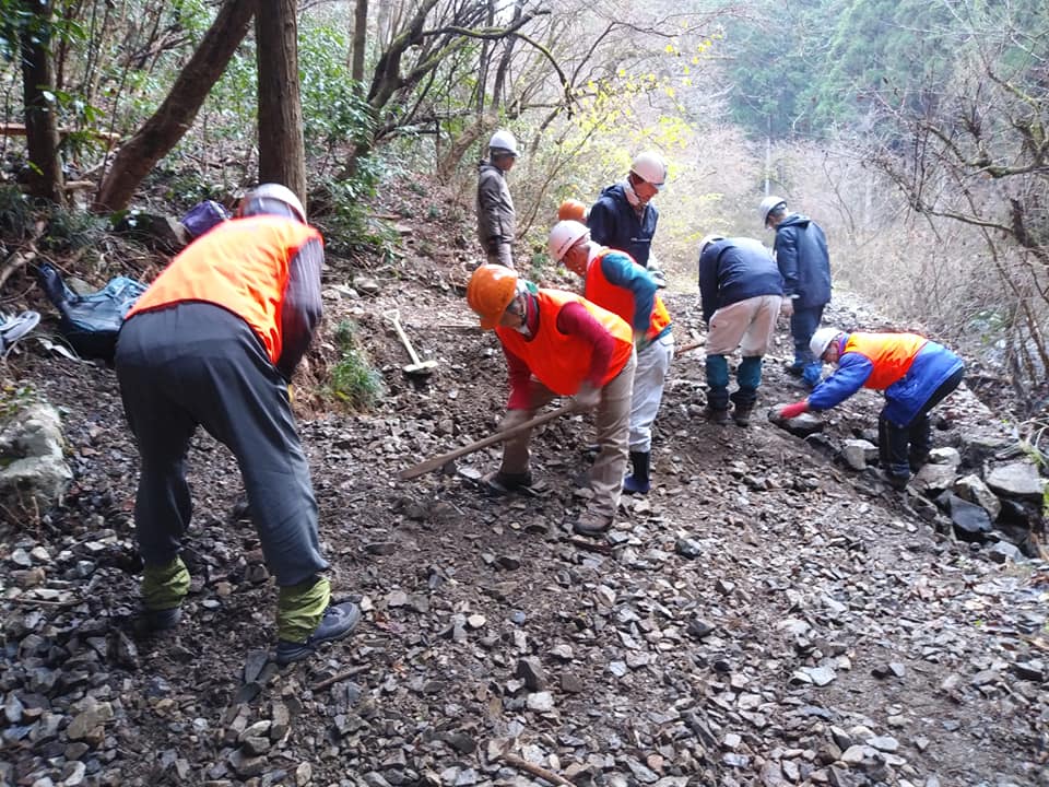 山からの大量の土石の除去をして林道を安全に歩けるように作業します。