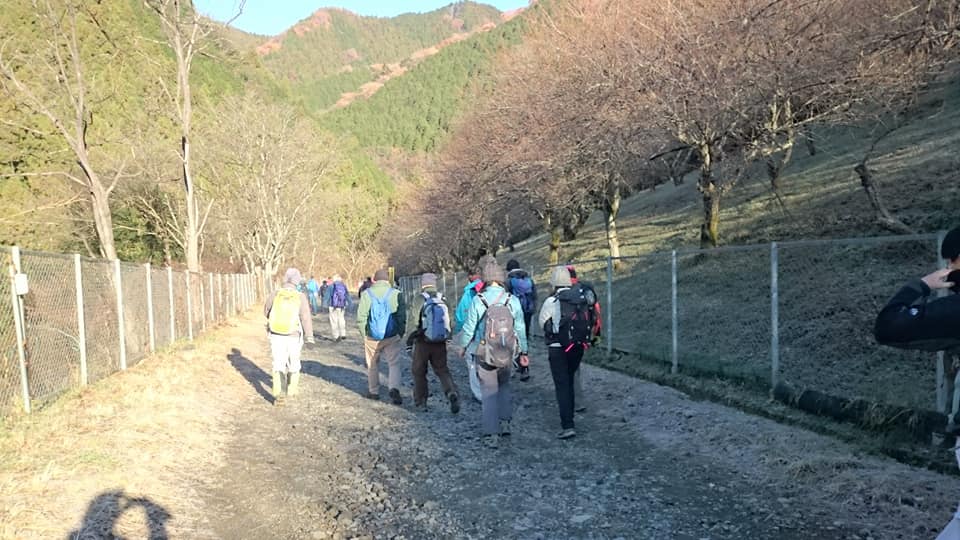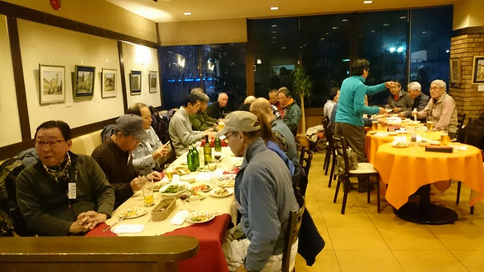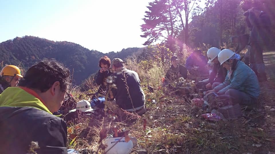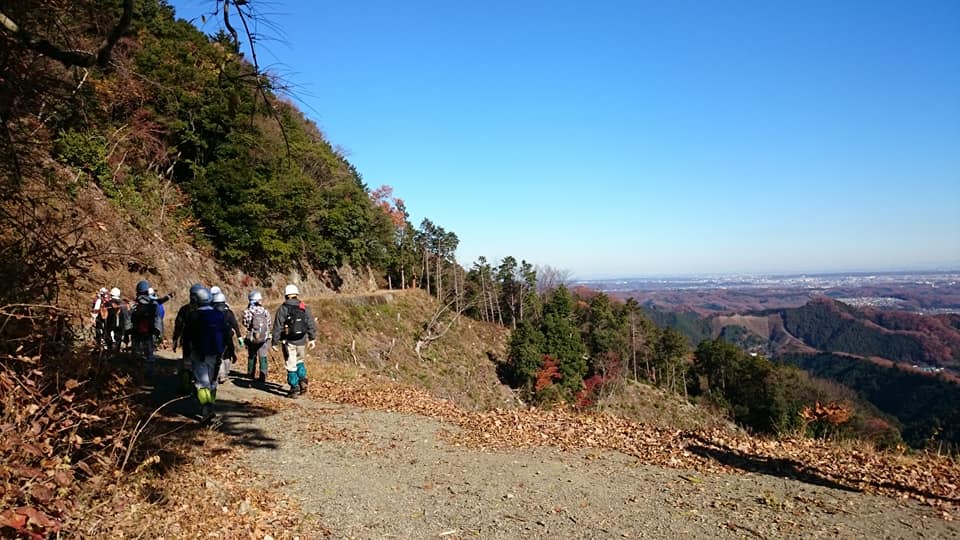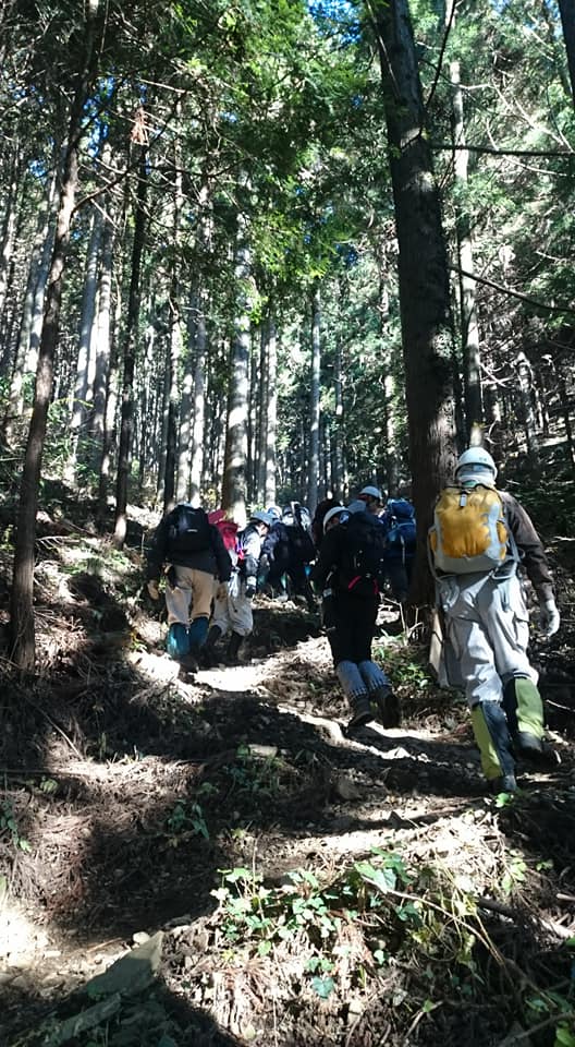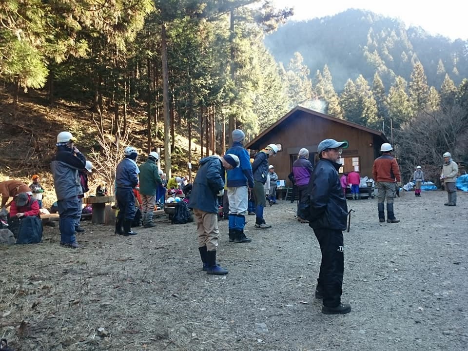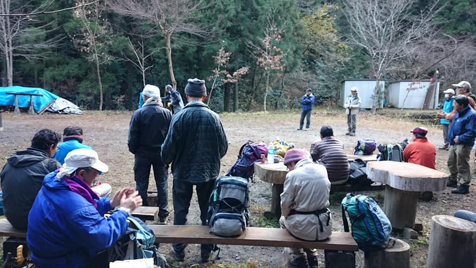 今日は晴天に恵まれての今年最後の定例作業でした。紅葉は終わりましたが名残の枯れ葉の中をベースに向かいます。今日は作業の後に忘年会があるので人数が多いですね。