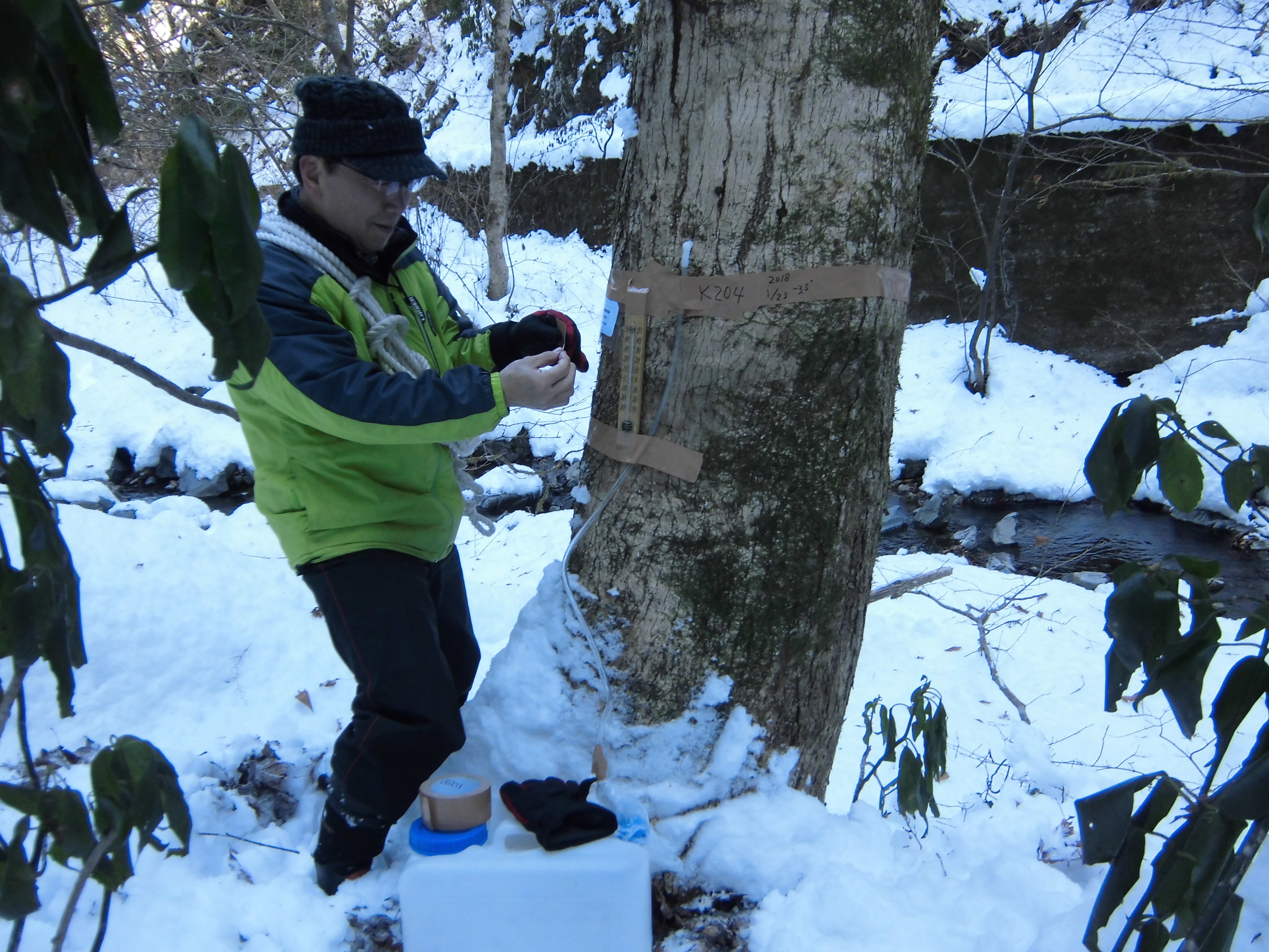 今回は、流動時期を正確に把握し採取器具を取り付ける必要がありので、その取り付けを積雪のある中、行ってきました。